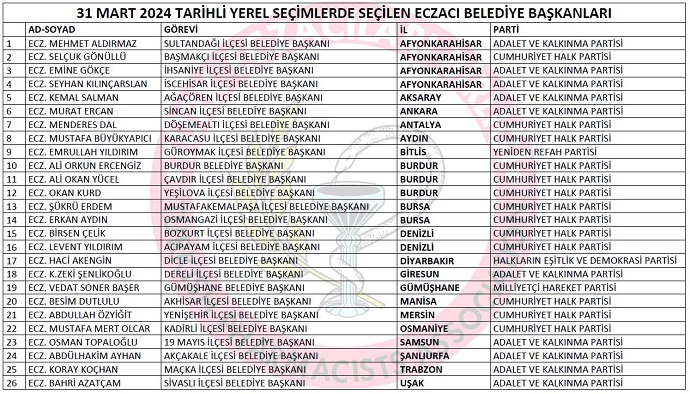 31 Mart 2024 tarihinde gerçekleşen 2024 Yerel Seçimlerinde 26 meslektaşımız, belediye başkanlığı görevine seçilmiştir.