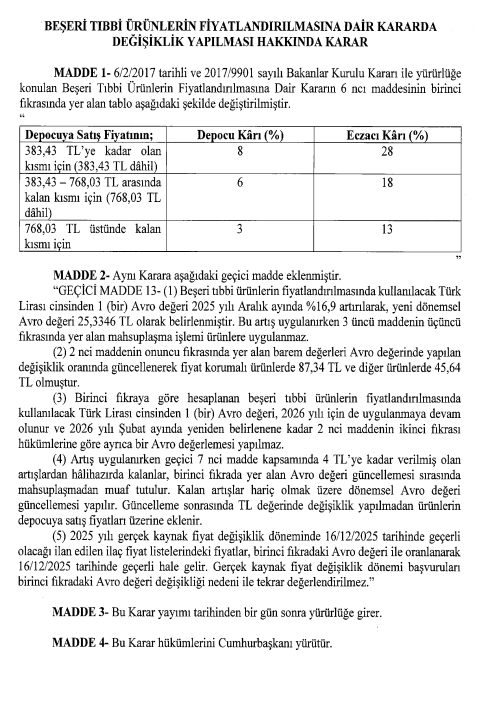 19.12.2025 tarihli ve 33112 sayılı Resmi Gazete’de “Beşeri Tıbbi Ürünlerin Fiyatlandırılmasına Dair Kararda Değişiklik Yapılması Hakkında Karar” yayımlandı.
