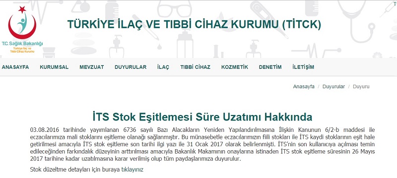Türkiye İlaç ve Tıbbi Cihaz Kurumu tarafından 28.03.2017 tarihinde Kurum internet sayfasında İTS Stok Eşitlemesi Süre Uzatımı Hakkında bir duyuru yayımlanarak, İTS stok eşitleme süresinin 26 Mayıs 2017 tarihine kadar uzatıldığı duyurulmuştur. Duyuru metni şu şekildedir: