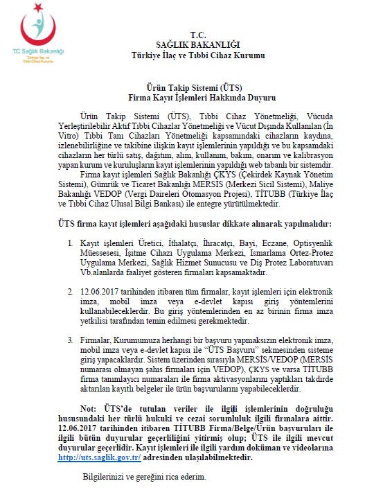 Türkiye İlaç ve Tıbbi Cihaz Kurumu tarafından “ÜTS HAKKINDA ÖNEMLİ DUYURU” başlıklı bir duyuru yayımlanmış olup, Ürün Takip Sistemine işlemlerinin yapılmasında dikkate alınacak hususlar hakkında bilgi içeren metin aşağıdaki şekildedir.