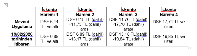 Söz konusu düzenlemelere istinaden 24/03/2013 tarihli ve 28597 sayılı Resmî Gazete’de yayımlanan Sosyal Güvenlik Kurumu Sağlık Uygulama Tebliğinde (SUT) değişiklik yapılıncaya kadar SUT’un “4.4.1 - Uygulanacak indirim oranları” maddesinde yer alan iskonto oranları için belirlenen baremlere ait 19/02/2020 tarihinden itibaren uygulanan depocuya satış fiyatları (DSF) aşağıda yer almaktadır.
