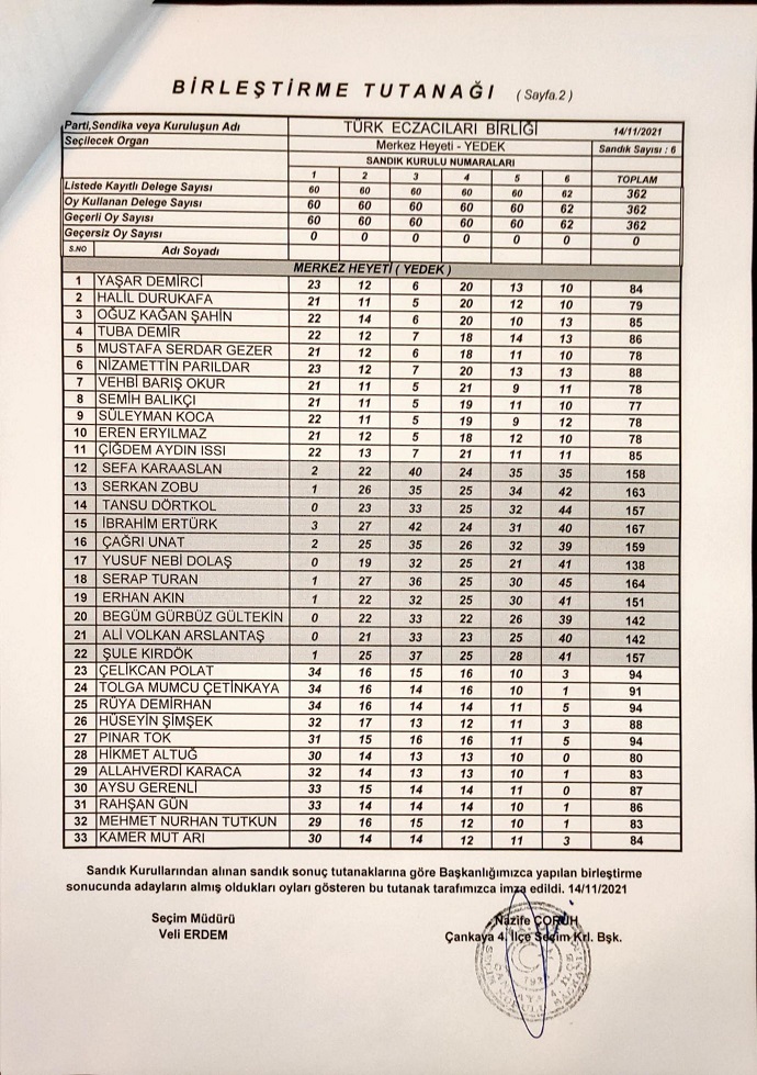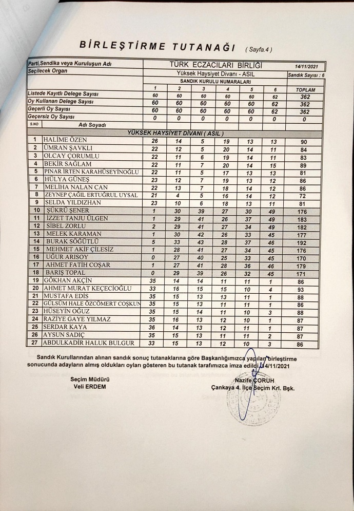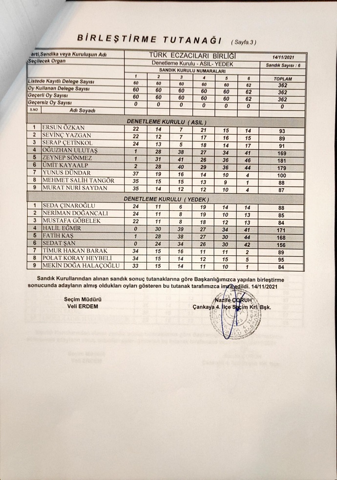 Türk Eczacıları Birliği 43. Olağan Büyük Kongresi’nin 14 Kasım 2021 tarihinde yapılan Merkez Heyeti, Denetleme Kurulu ve Yüksek Haysiyet Divanı seçimleri için kesin olmayan sonuçları gösterir seçim tutanakları aşağıda yer almaktadır.