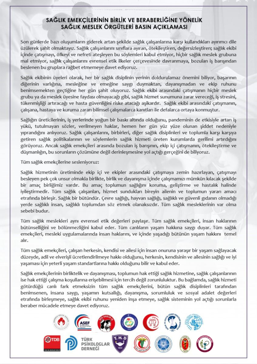 Sağlık Emekçilerinin Birlik ve Beraberliğine Yönelik Sağlık Meslek Örgütleri Basın Açıklaması