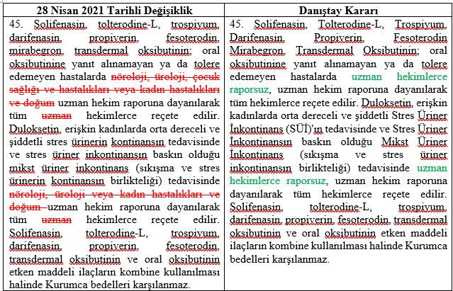 “Danıştay Onuncu Dairesinin 25.11.2021 tarihli ve 2021/3964 Esas numaralı kararı ile; 24/03/2013 tarih ve 28597 sayılı Resmi Gazetede yayımlanan Sosyal Güvenlik Kurumu Sağlık Uygulama Tebliğinin eki “Ayakta Tedavide Sağlık Raporu (Uzman Hekim Raporu/ Sağlık Kurulu Raporu) ile Verilebilecek İlaçlar Listesi (Ek 4/F)” nin 28/04/2021 tarih ve 31468 (Mükerrer) sayılı Resmi Gazetede yayımlanan Sosyal Güvenlik Kurumu Sağlık Uygulama Tebliğinde Değişiklik Yapılmasına Dair Tebliğin 28 inci maddesinin birinci fıkrasının (c) bendi ile değiştirilen 45 inci maddesinin birinci ve ikinci cümlelerinin yürütmesi durdurulmuştur.